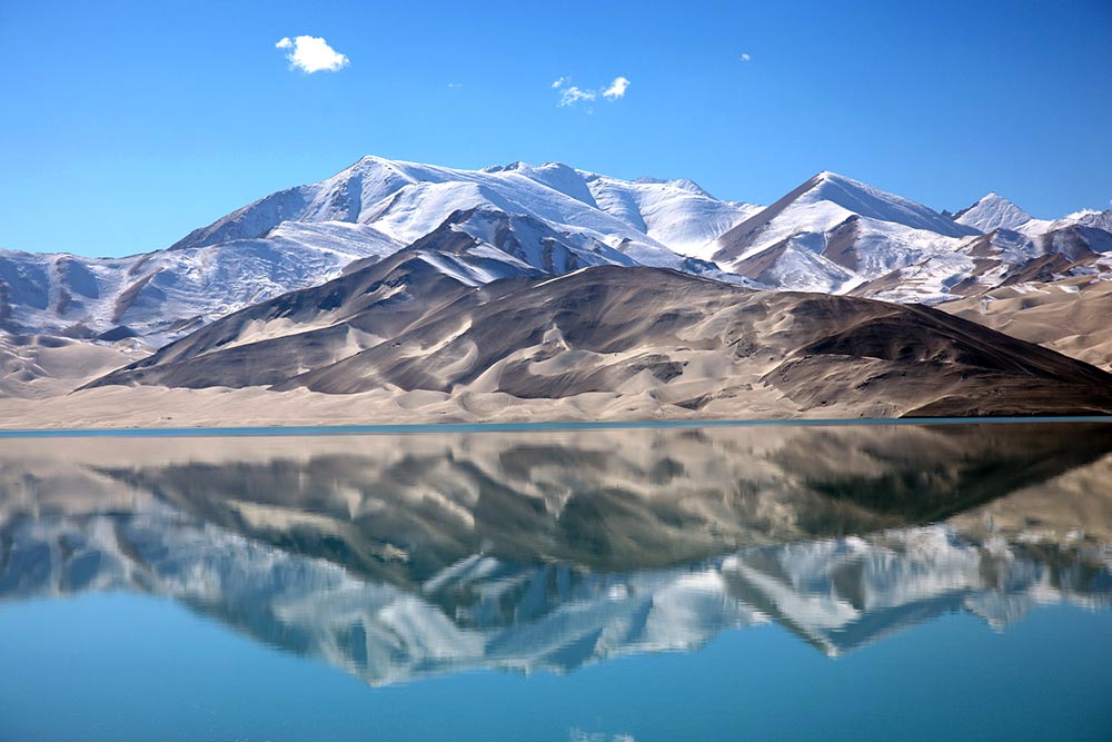 سطح آب با تغییر زاویهی نور خورشید از آبی تیره تا نقرهای تغییر رنگ میدهد. بازتاب کوههای پامیر بر سطح آرام دریاچه، تصویری شبیه نقاشی خلق میکند.