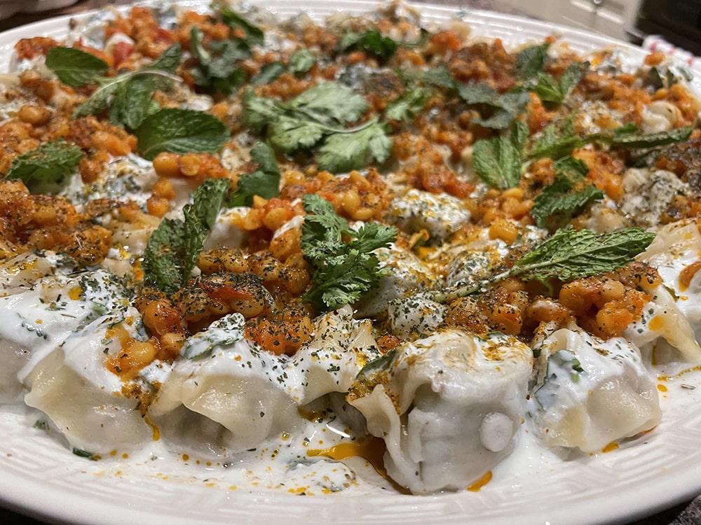 نوعی دامپلینگ بخارپز است که با گوشت چرخکرده و پیاز پر میشود. در جشنها و مهمانیها بسیار محبوب است و معمولاً با ماست و فلفل سرو میگردد.