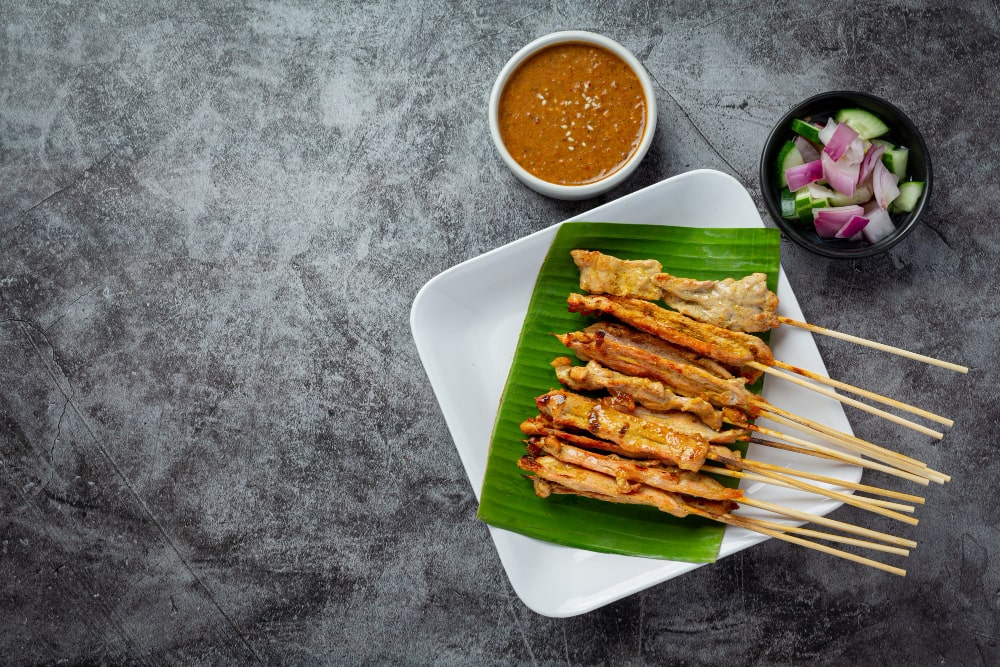 سیخهای گوشت گریلشده همراه با سس بادامزمینی که معمولاً در بازارهای شبانه فروخته میشود.