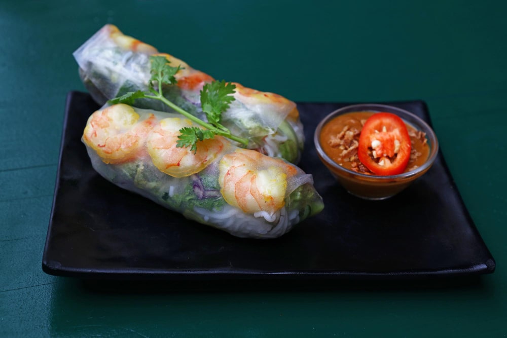 رولهای بهاری با میگو، سبزیجات و نودل برنج که با سس بادامزمینی یا ماهی سرو میشوند؛ غذایی سبک، خوشطعم و محبوب بین گردشگران.