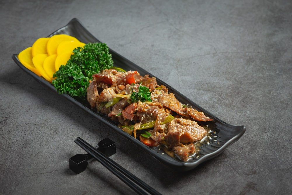 برشهای نازک گوشت گوساله که در سس سویا و سیر مزهدار شده و روی آتش پخته میشود.