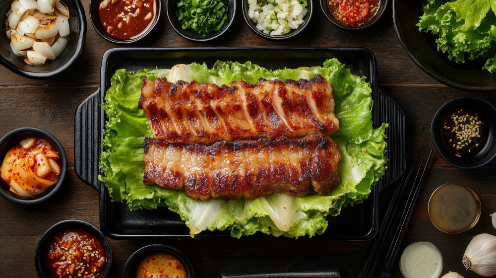 تکههای گوشت خوک کبابی که در برگهای کاهو پیچیده میشود و با سیر، پیاز و سس مخصوص سرو میشود.